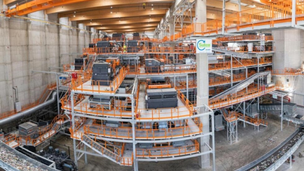 In einer Halle von knapp 14.000 m2 wird auf Förderbändern von 3,2 km Länge über sechs Stockwerke Müll aus dem gelben Sack und der gelben Tonnen sortiert.